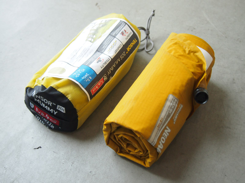 スタッフサックに入ったTENSOR 20のSサイズ(122×51cm)とTHERMARESTのNeoAir XLiteのSサイズ(119×51cm)(⇒■)を比べたところ、同じくらいのサイズには見えますが、圧縮するとNEMOの方がわずかに薄くコンパクトでした。