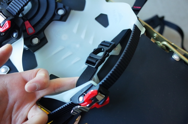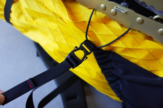 サイドのコンプレッションストラップがパック前面にものを挟み込むためのストラップとなる機構は優れもの。