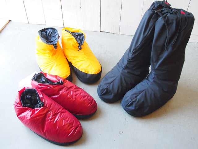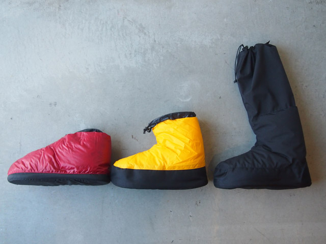 軽さに特化したフラッシュブーティー(⇒■)、軽さと保温、歩行性も考慮されたダウンブーティー(⇒■)、ウィンドストッパーを使い、膝下まで防風性能を持たせエクスペディションブーティー(⇒■)。