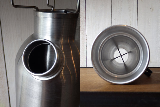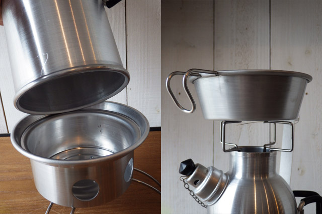 ケトル部分は筒状ですが、側が2層構造になっており、そこに水を入れ、下部の器に枯れ葉や枝等を入れて燃やすと、煙突効果で意外なほど早く水を沸かすことが出来ます。