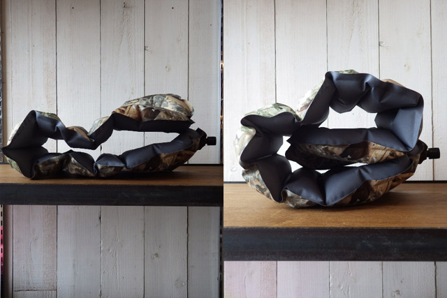 “CUSH”(⇒■)は使用時の大きさからは想像出来ないですが、わずかひと息で膨らます事が出来、縦に区切られた節で多彩なアレンジが出来てしまうアイデアピロー!