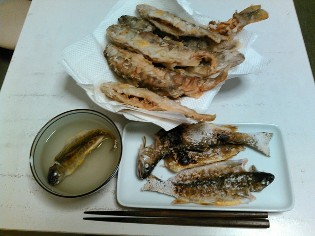 帰ってからアマゴはから揚げ、イワナは塩焼き、骨酒を堪能。