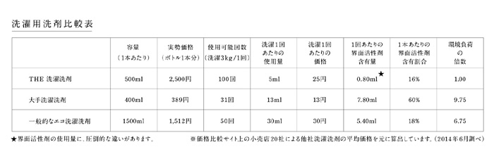 メーカーの調べによると、1回(3Kg)分の洗濯で一般的な洗剤は、約13円掛かるのに対して、「THE 洗濯洗剤」は、その約倍の約25円も掛かります。