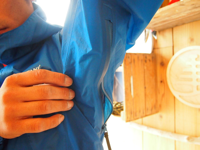 脇下にはベンチレーションが配され、雨天行動時の熱気をしっかり外へ排出してくれます。
