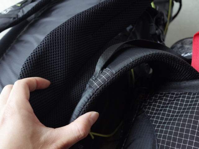 テラノバと同じように厚手のショルダーパッドを装備し、このクラスのザックにしては珍しくスタビライザーを装備。