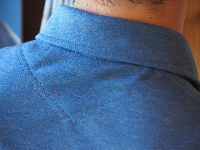 首もとのステッチは飾りだけではなく、汗をよくかく場所なだけに生地が二重になっております。