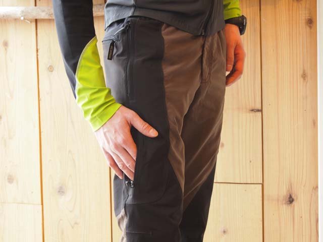 茶色い生地の部分はさらっとした肌触りで吸汗速乾性に優れた“WICKINGTEXナイロン”、膝からヒップにかけては脚の動きを制限しないよう撥水性のあるストレッチ素材を用い、屈伸運動時のストレスは殆どありません。
