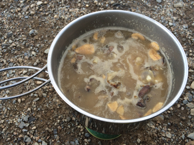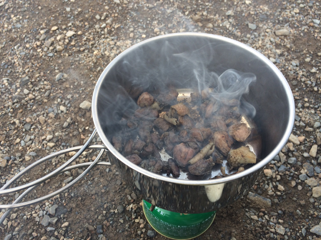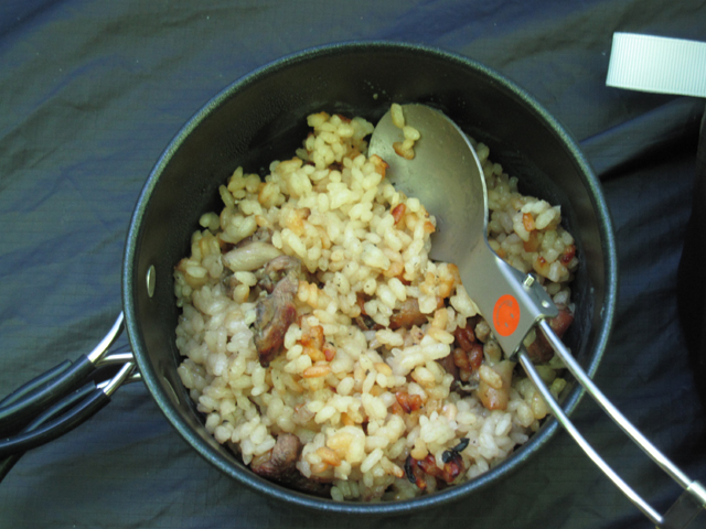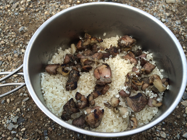 下界から生米と真空パックされた加工鶏肉とコンソメの素とガーリーックチップを持って行き、いざ調理開始。