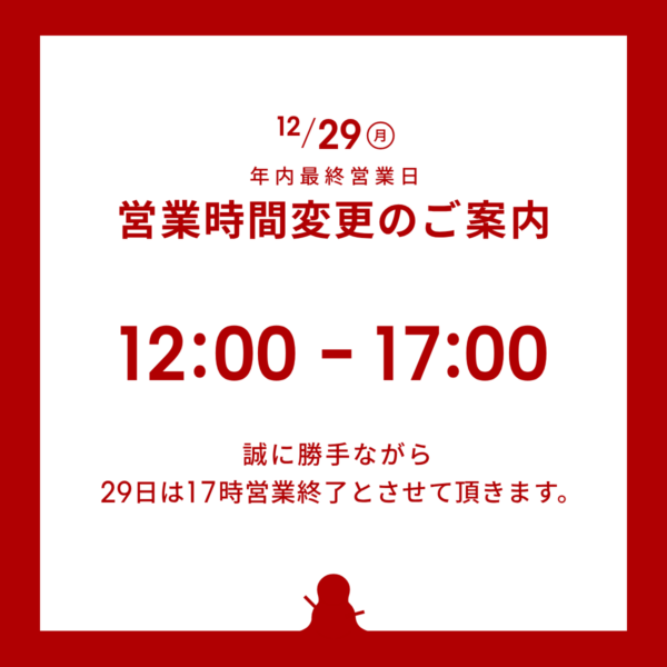 ※誠に勝手ながら、29日(月)は17時営業終了とさせていただきます。